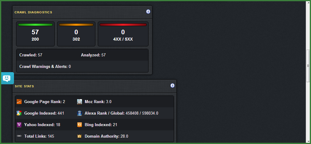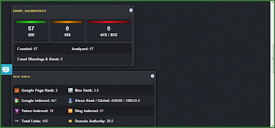 | Overview of your crawl diagnostics and your site stats like Google Page Rank, Moz Rank, Alexa ranking, domain authority and search engines who indexed your blog posts. |